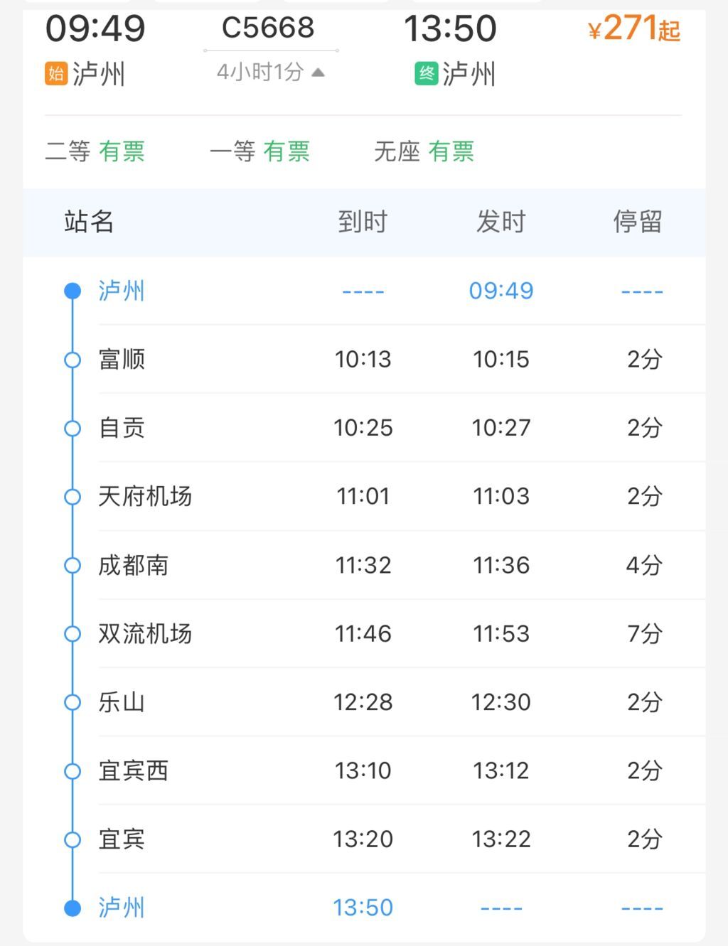 值得注意的是,渝昆高铁川渝段另开通了泸州到泸州的环线动车组列车2列,沿途停靠宜宾、乐山、双流机场、成都南、天府机场、自贡等站,共耗时4小时左右。