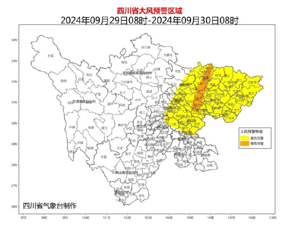 四川省气象台28日15时30分发布大风黄色预警:29日08时到30日08时,盆地有一次大风天气过程,广元、巴中、南充、遂宁、资阳、内江、达州、广安8市和绵阳、德阳、成都、眉山4市东部风力普遍有5-7级,局部可达8级或以上。相关区域需注意预防局地极端大风带来的危害。