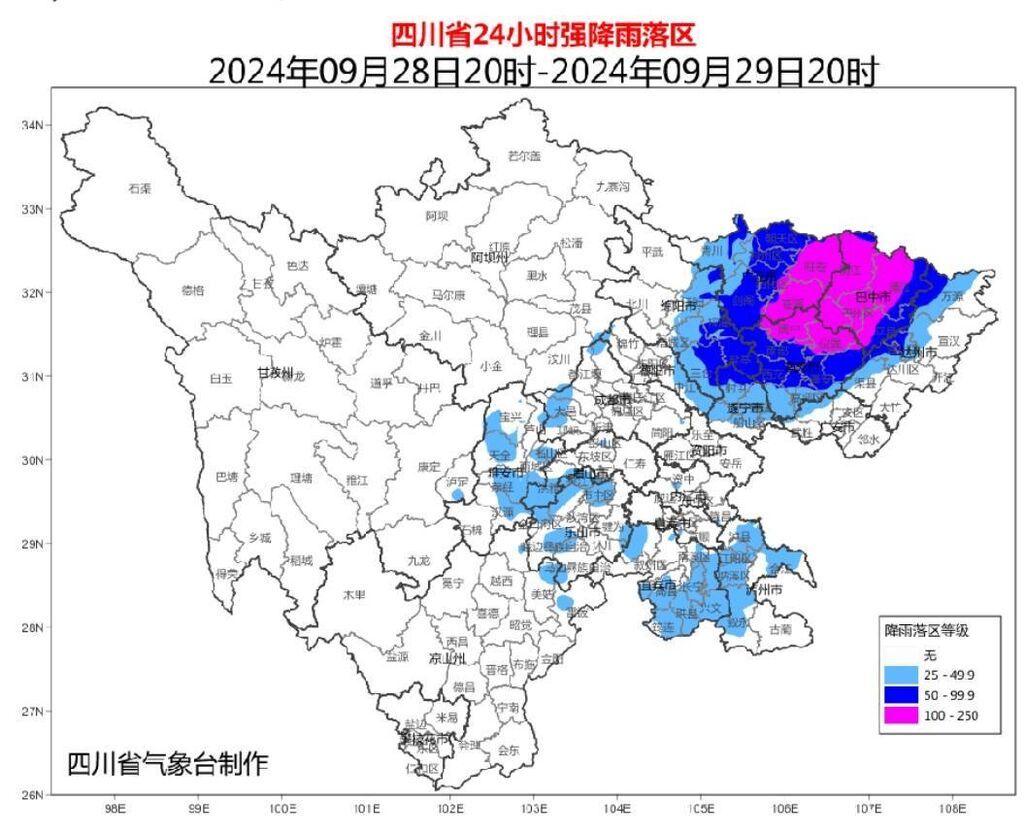 四川省气象台9月28日15时50分发布暴雨蓝色预警: 9月28日20时到29日20时:广元、巴中、南充3市和绵阳东部及达州西部有暴雨(雨量50~80毫米),局部大暴雨(雨量120~150毫米),最大小时雨量30~60毫米,局部地方伴有雷暴大风等强对流天气。