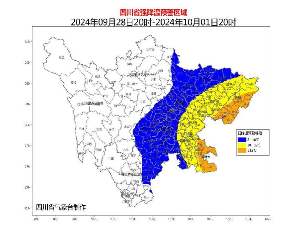 四川省气象台9月28日15时40分发布强降温蓝色预警:受强冷空气影响,9月28日20时~10月1日20时四川盆地大部和凉山州东部有一次强降温天气过程,日平均气温将累计下降7—9℃,其中达州、南充、巴中、遂宁、资阳、内江、自贡、宜宾、泸州9市的部分地方日平均气温将累计下降10℃以上。