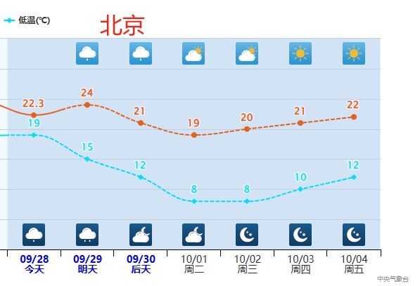 在冷空气和阴雨雪天气的打压下,未来几天,我国将出现大范围气温创新低的情况。北方最高气温最低值大多出现在10月1日,届时,北京、天津、沈阳、呼和浩特、太原、西安、银川、济南都将迎来下半年来最寒凉的一天。尤其要提醒计划在国庆节凌晨去天安门广场看升旗仪式的小伙伴们,当天最低气温只有10℃上下,一定要备足保暖衣物,千万不要着凉感冒!