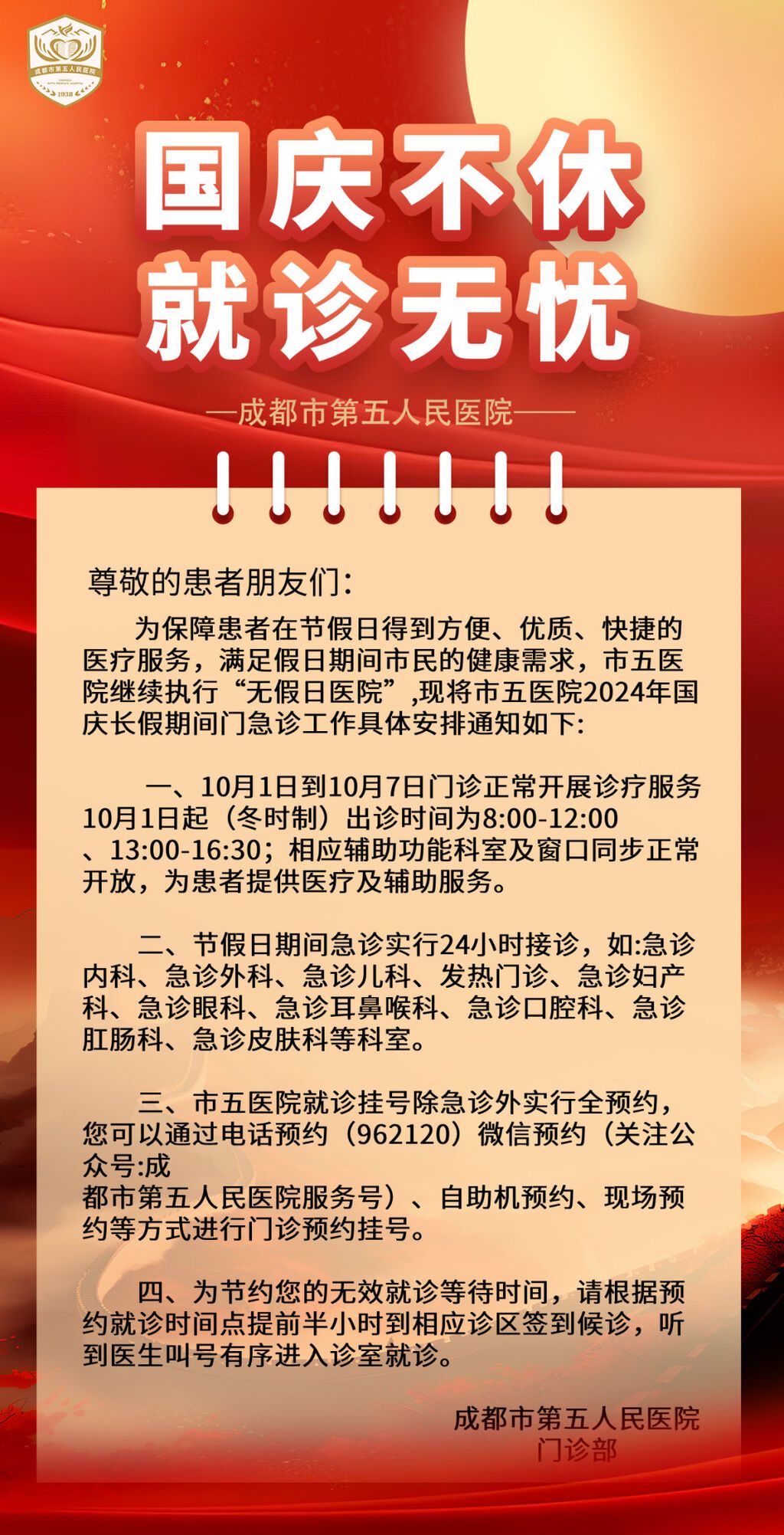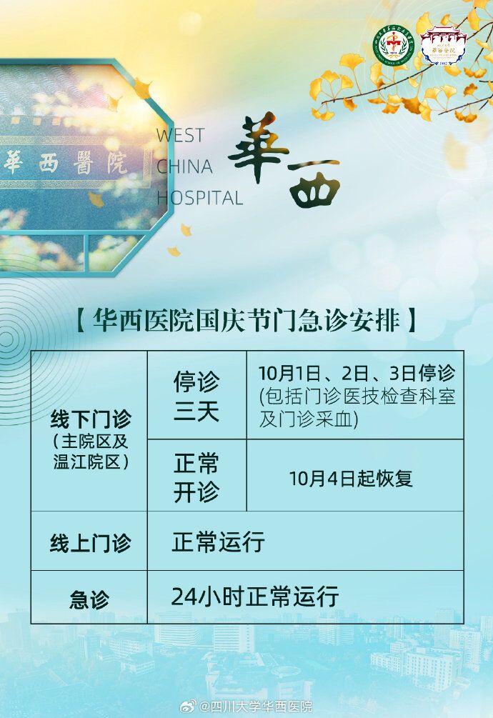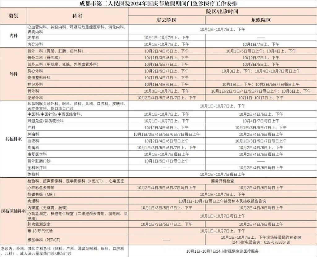 国庆期间,为满足广大患者就医需求,成都市中西医结合医院(市一医院)2024年10月1日—7日,门诊、急诊,互联网门诊均正常开诊。