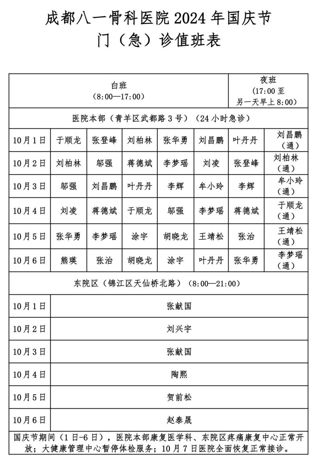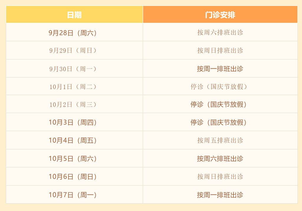 国庆节假期(10月1日—10月7日),门诊出诊安排如下: