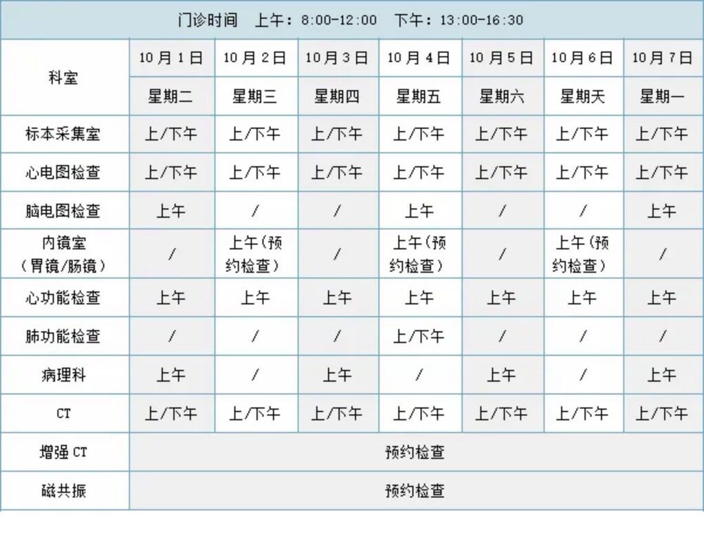 体检中心:10月1日—10月5日全面停诊,10月6日—10月7日上午开诊,下午休息。10月8日正常开诊。