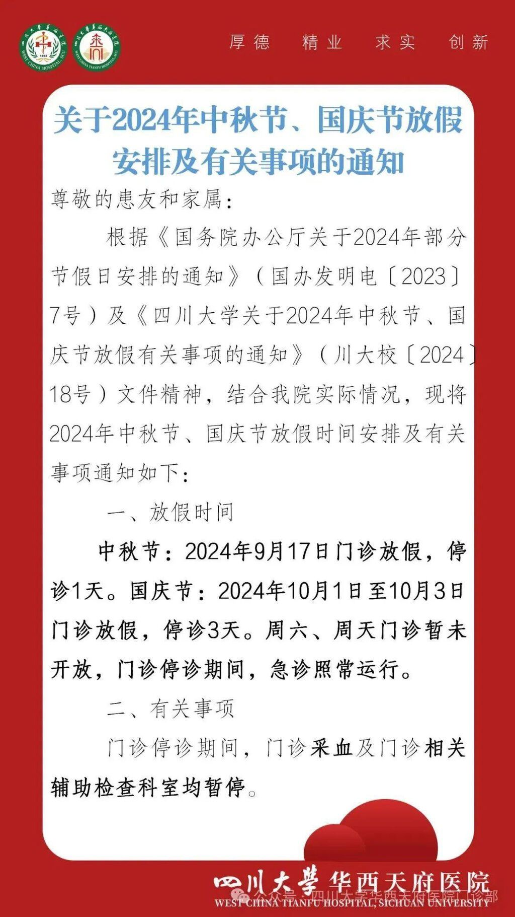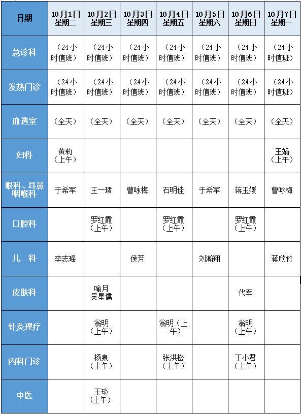 中医外科、针灸一科、小儿推拿科、计划生育科、临床药学科、门特续方门诊2024年10月1日—7日不开诊。