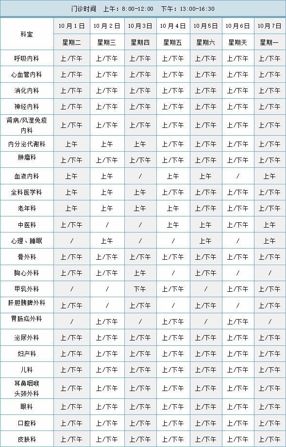 血液风湿科:10月1日—10月7日上午半天,10月8日正常开诊。