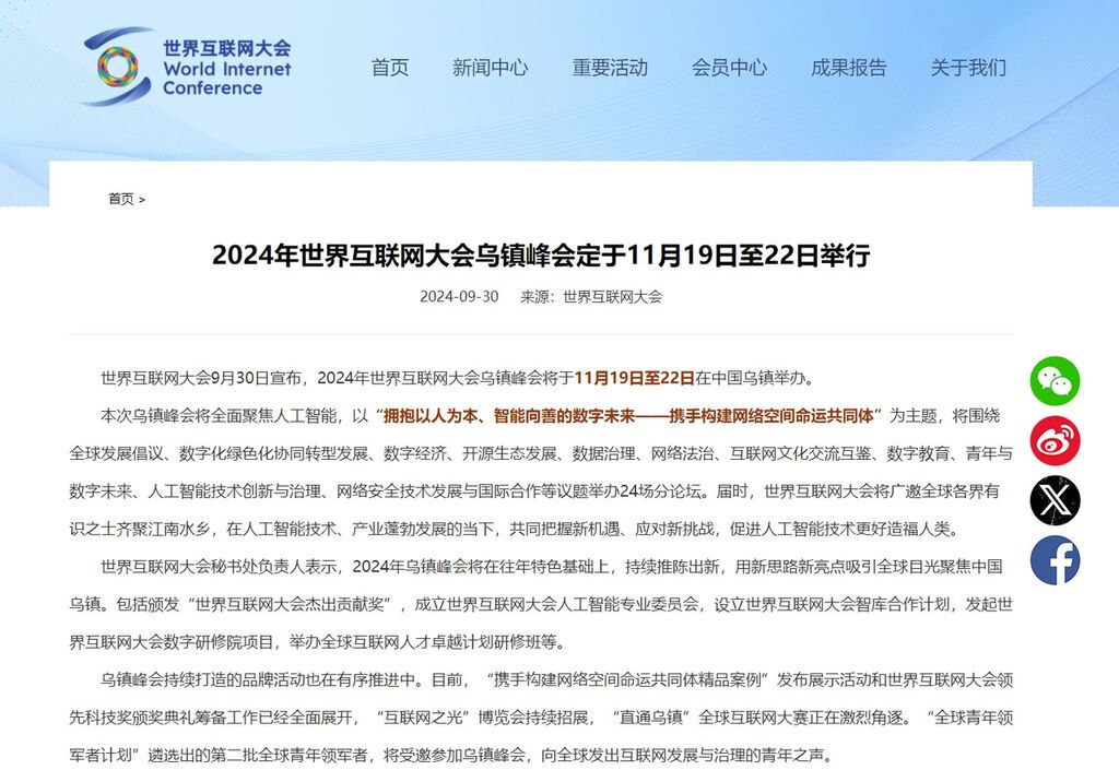世界互联网大会9月30日宣布,2024年世界互联网大会乌镇峰会将于11月19日至22日在中国乌镇举办。