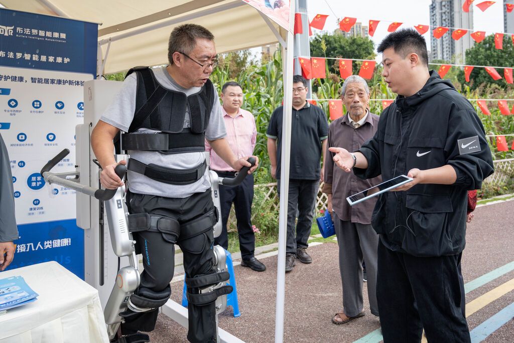除了小家居小家电,适老化产品展区还展出了许多医疗康复类产品,比如下肢步行外骨骼(智能康复设备)、紧急呼叫器、护理用品等等,吸引了不少健康需求较大的老年朋友驻足,甚至不少老人直接开机体验。