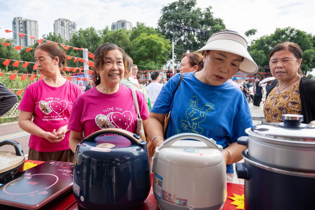 在活动现场搭建的适老化产品专区,十余款各式各样的电饭煲被前来看热闹的大爷大妈围观。和商场里陈列精美、功能强大的电饭煲不同,这些电饭煲体型相对较小,功能较为单一,价格全部在100元-300元之间。