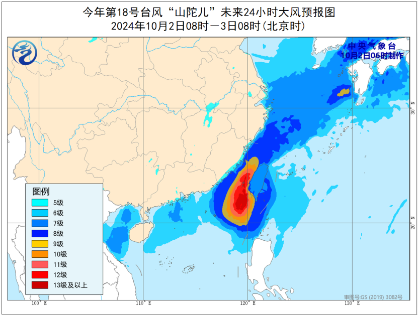 大风预报:10月2日08时至3日08时,浙江沿海、福建沿海、台湾岛沿海、黄海南部海域、东海北部海域、台湾以东洋面、东沙群岛、澎湖列岛将有6-8级、阵风9-10级的大风;东海南部海域、台湾海峡、巴士海峡、南海东北部偏东海域将有9-12级、阵风13-14级的大风,台风中心经过的附近海域或地区风力可达13-15级,阵风16-17级。