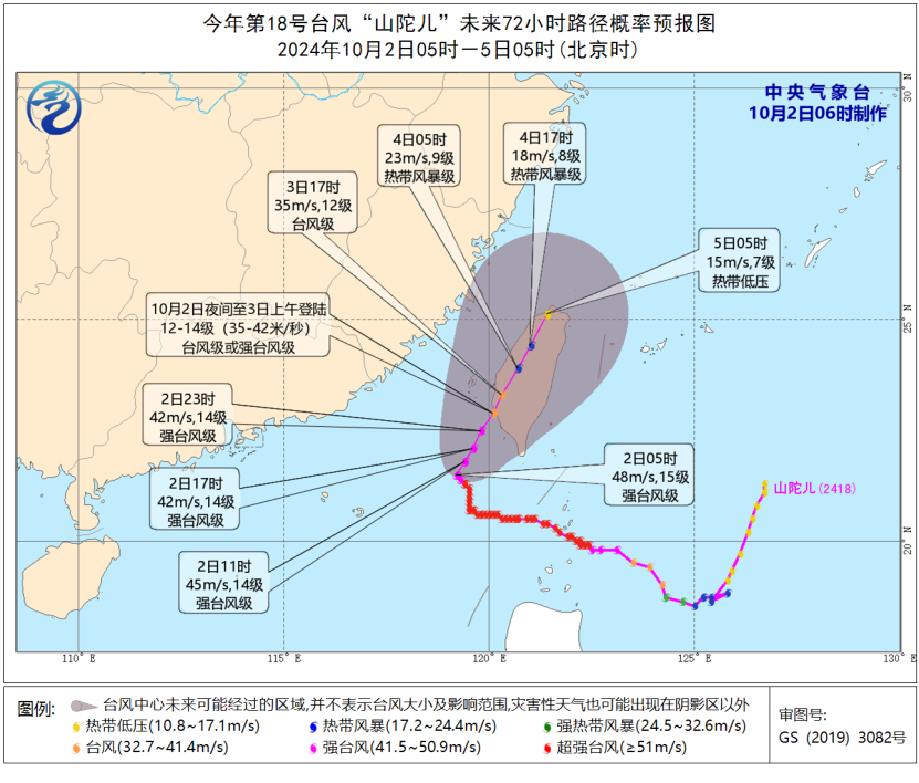 预计,“山陀儿”将以每小时5-10公里的速度向北偏东方向缓慢移动,强度逐渐减弱,将于10月2日夜间至3日上午在台湾岛西南部沿海登陆(台风级或强台风级,12-14级,35-42米/秒),自南向北穿过台湾岛,强度明显减弱。