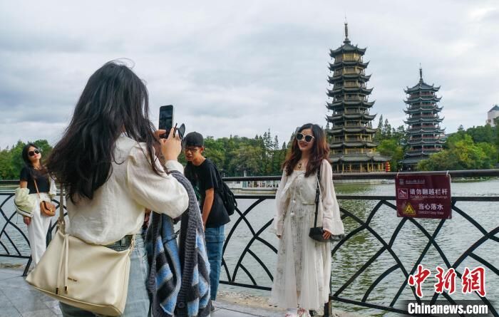 10月1日,国庆黄金周首日,中外游客纷纷来到广西桂林参观游览,象鼻山景区、两江四湖景区、东西巷等桂林市区旅游景点游人如织,热闹非凡。