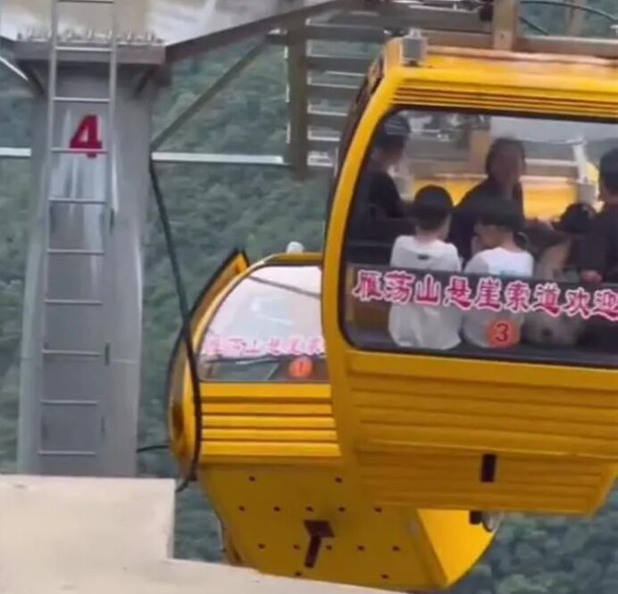 10月1日,有网友在社交媒体上发文称,雁荡山景区内一辆缆车发生故障,导致一名游客意外坠落,并配有图片。图片显示,一辆印有“雁荡山悬崖索道欢迎”的黄色缆车在空中倾斜。