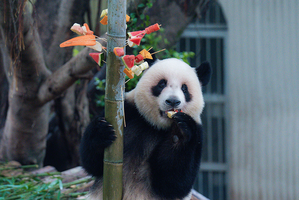 重庆:大熊猫撸水果串,憨态可掬。