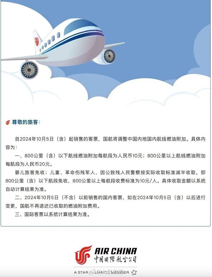 近日,国航、东航、南航等多家航司调整国内航线燃油附加费收取标准:2024年10月5日(含)起销售的客票,800公里(含)以下航段,每位旅客收取人民币10元;800公里以上航段,每位旅客收取人民币20元。详细调整规则以各航司通知为准↓↓↓