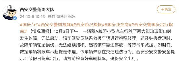 西安公安交警安全提示:节假日驾车出行,请提前检查好车辆状况,确保安全出行。