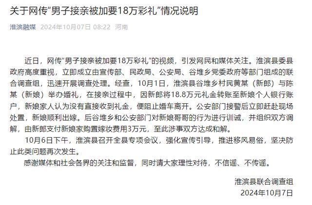 据淮滨融媒官微消息,近日,网传“男子接亲被加要18万彩礼”的视频,引发网民和媒体关注。淮滨县委县政府高度重视,立即成立由宣传部、民政局、公安局、谷堆乡党委政府等部门组成的联合调查组,迅速开展调查处理。经查,10月1日,淮滨县谷堆乡村民黄某(新郎)与陈某(新娘)举办婚礼,在接亲过程中,因新郎将18.8万元礼金转账至新娘个人银行账户,新娘家人认为没有直接收到礼金,便阻止婚车离开。公安部门接警后立即赶赴现场处置,新娘顺利出嫁。后谷堆乡和公安部门对新娘哥哥的行为进行训诫,并组织双方调解,由新郎支付新娘家购置嫁妆费用3万元,至此涉事双方达成和解。