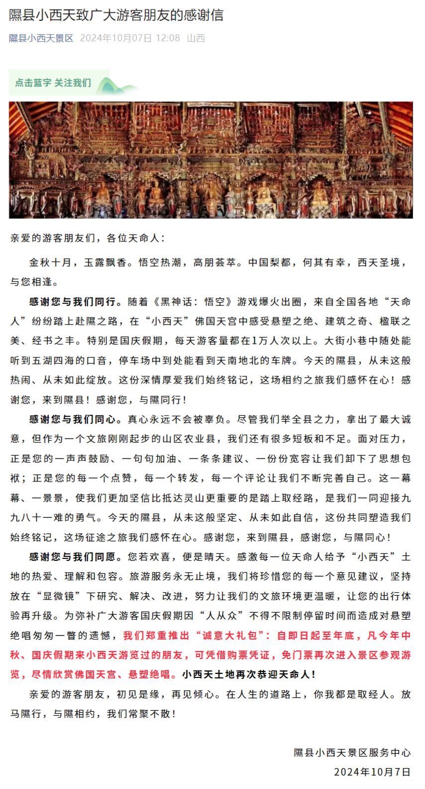 央视网消息:据隰县小西天景区微信公号消息,自即日起至年底,凡今年中秋、国庆假期来小西天游览过的朋友,可凭借购票凭证,免门票再次进入景区参观游览,尽情欣赏佛国天宫、悬塑绝唱。小西天土地再次恭迎天命人!