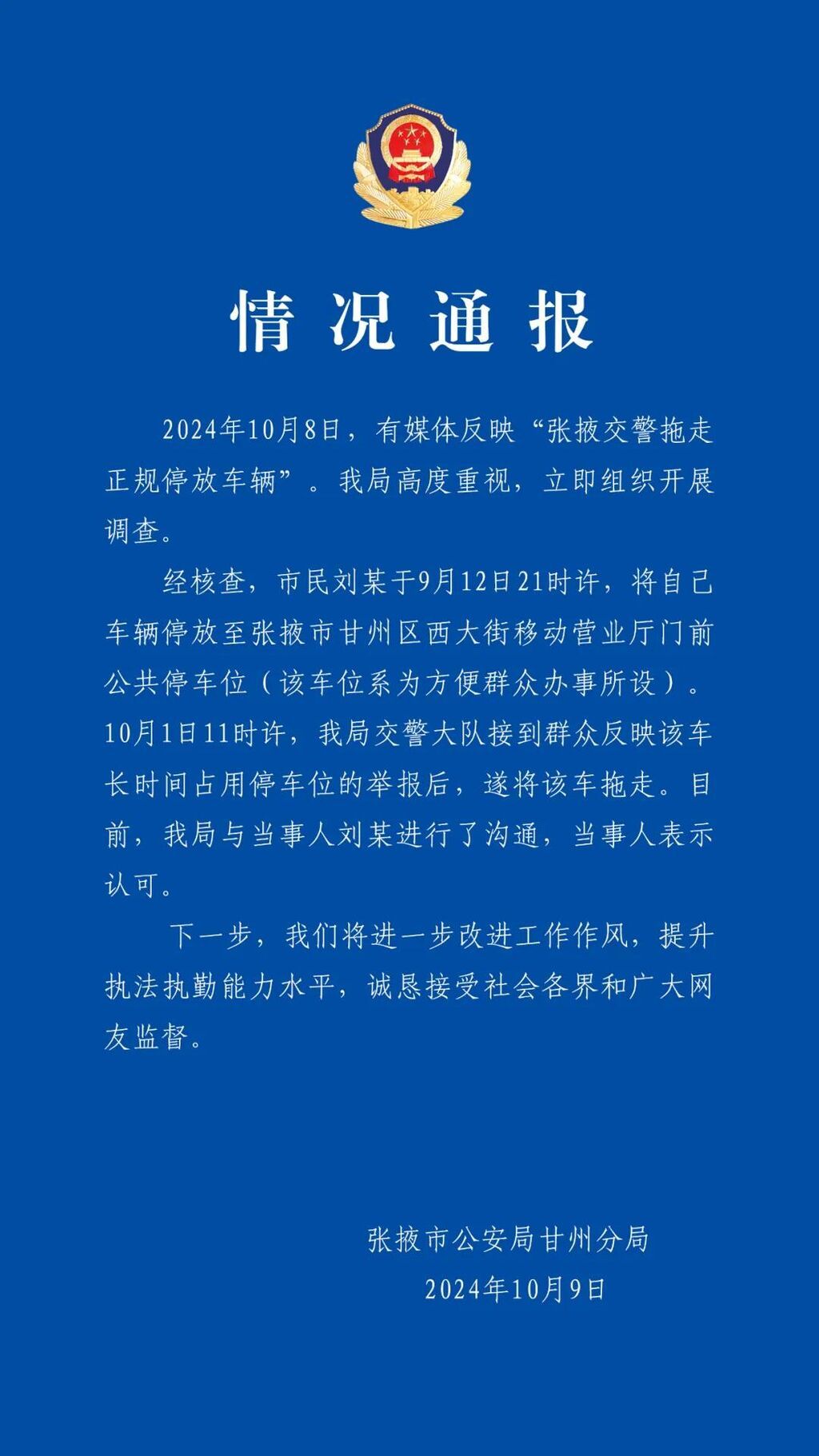 经核查,市民刘某于9月12日21时许,将自己车辆停放至张掖市甘州区西大街移动营业厅门前公共停车位(该车位系为方便群众办事所设)。10月1日11时许,张掖市公安局甘州分局交警大队接到群众反映该车长时间占用停车位的举报后,遂将该车拖走。目前,张掖市公安局甘州分局与当事人刘某进行了沟通,当事人表示认可。