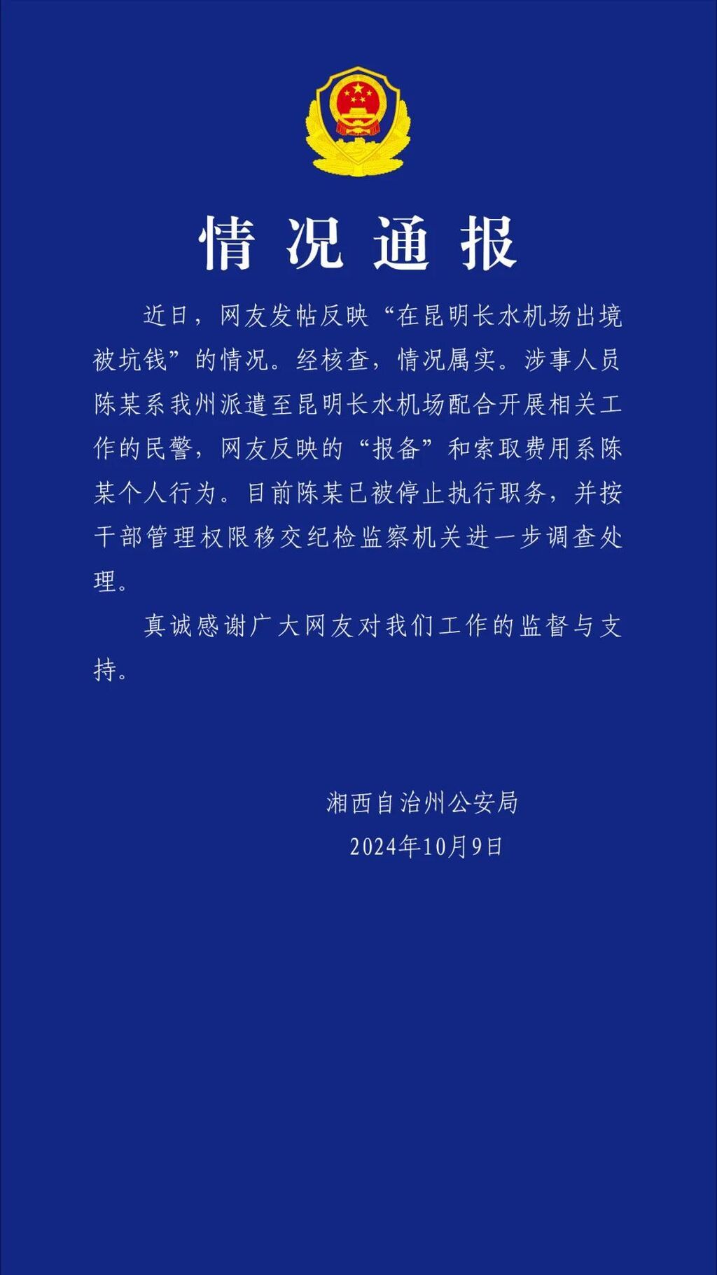 中新网10月9日电 据“湘西公安”微信公众号消息,湖南省湘西自治州公安局9日发布情况通报称,近日,网友发帖反映“在昆明长水机场出境被坑钱”的情况。经核查,情况属实。涉事人员陈某系湘西自治州派遣至昆明长水机场配合开展相关工作的民警,网友反映的“报备”和索取费用系陈某个人行为。目前陈某已被停止执行职务,并按干部管理权限移交纪检监察机关进一步调查处理。