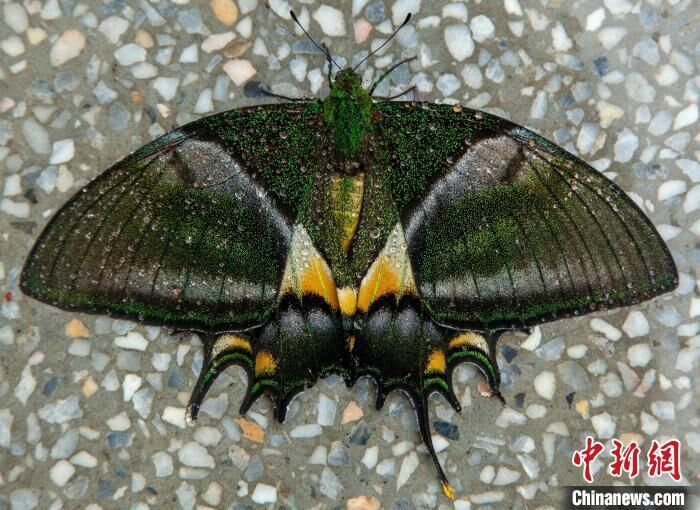 日前,广东车八岭国家级自然保护区管理局工程师肖荣高刚完成工作,走出车八岭自然博物馆时,就被大门旁边一只漂亮的蝴蝶吸引住了,他走近细看,根据蝴蝶外形、斑纹、颜色等特征,确定这是一只金斑喙凤蝶。