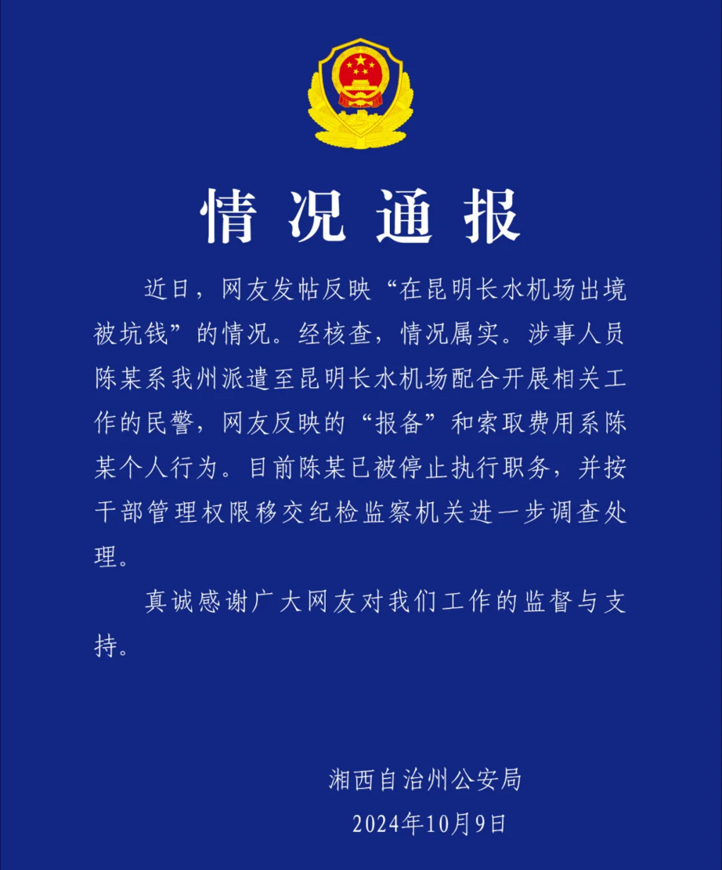 ·旅客机场出境被坑钱,湖南湘西公安:系个人行为,已停职。