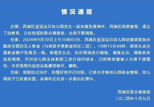 ·南昌通报幼儿园一幼童坠楼事件:已排除被人为推下楼情况。