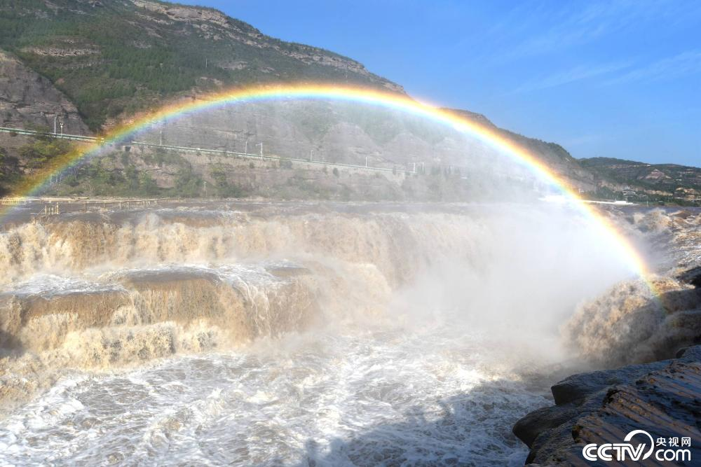 近日,受上游降雨和水库调节放水影响,黄河壶口瀑布水量增大,水势浩荡,飞溅的水雾在阳光的照射下,形成彩虹桥景观,吸引了众多游客。