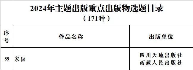 由天地出版社、西藏人民出版社联合出版的,甘孜州籍作家达真创作的长篇小说《家园》入选。这是目前甘孜州唯一一部被列入中宣部重点出版物的作品。