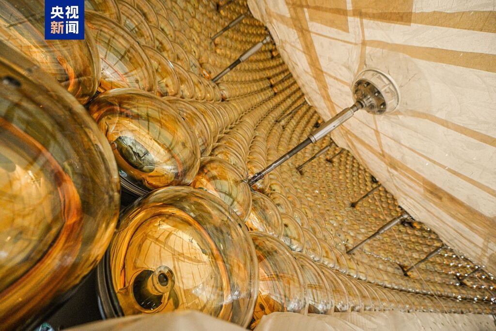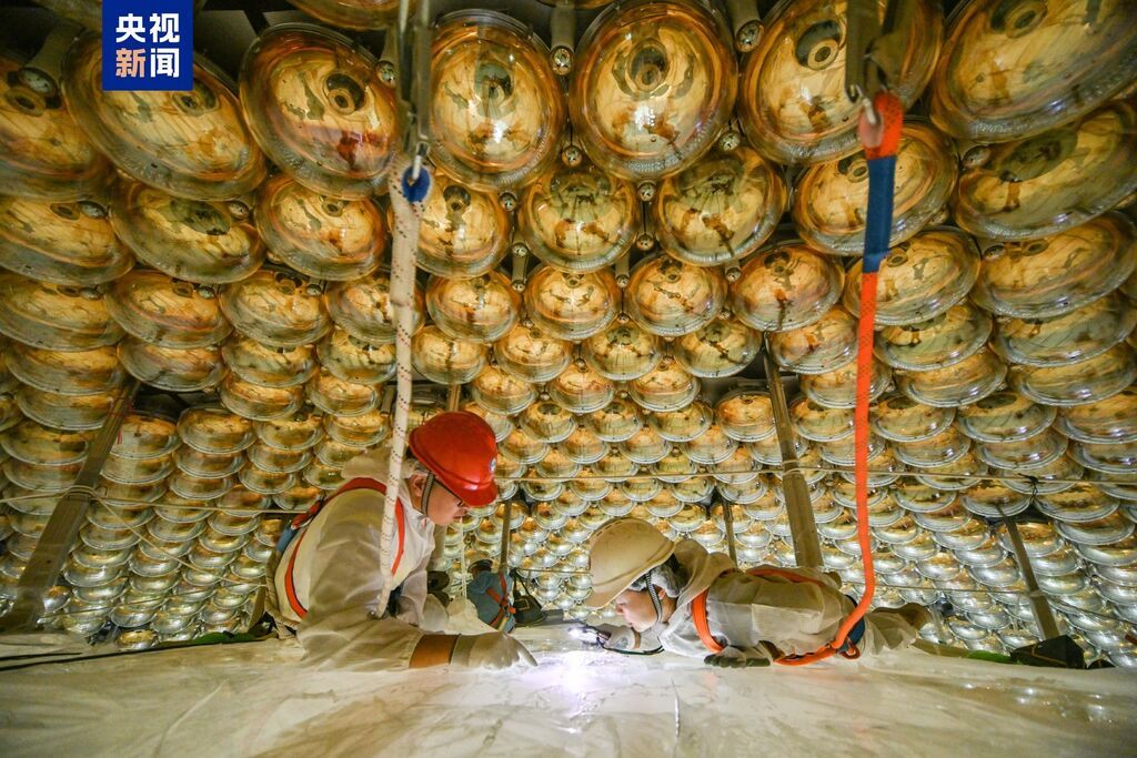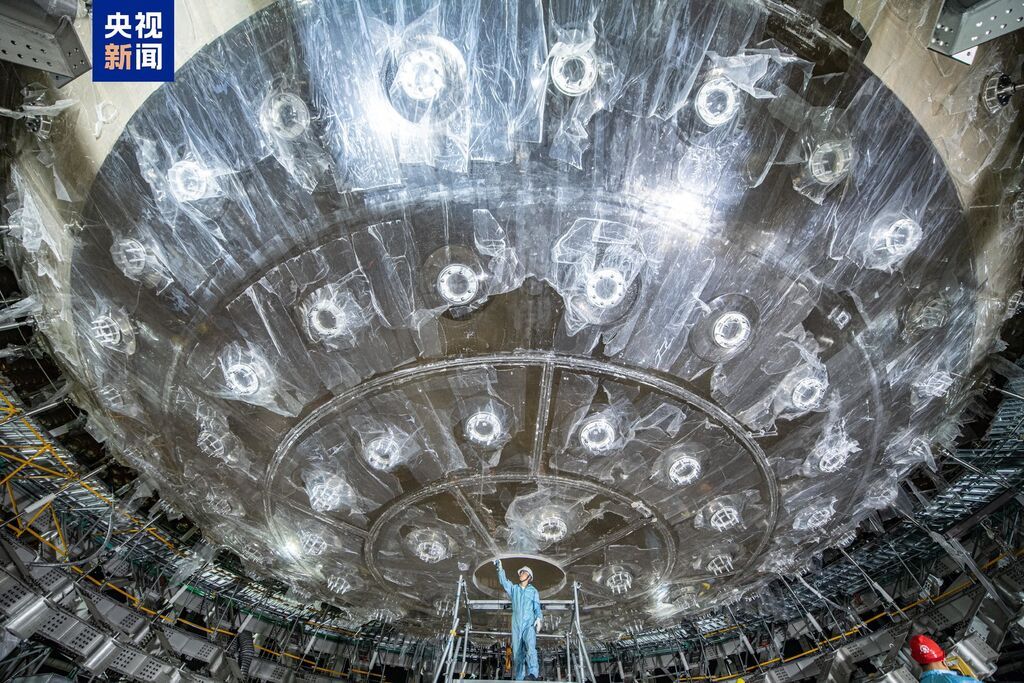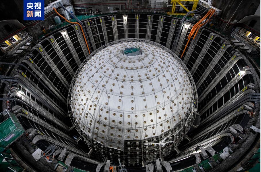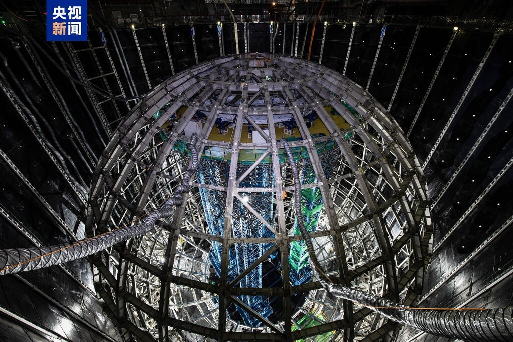 江门中微子实验2013年立项,2015年开工建设地下实验硐室,2021年底,地下硐室交付使用并开始探测器安装。目前,江门中微子实验中心探测器最内层的有机玻璃球已合拢,外层的不锈钢网架和光电倍增管也在有序合拢中,预计11月底完成全部安装任务,并启动超纯水、液体闪烁体的灌装,2025年8月正式运行取数,预计运行约30年。