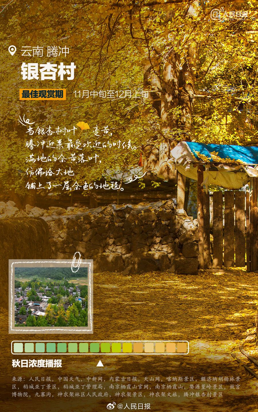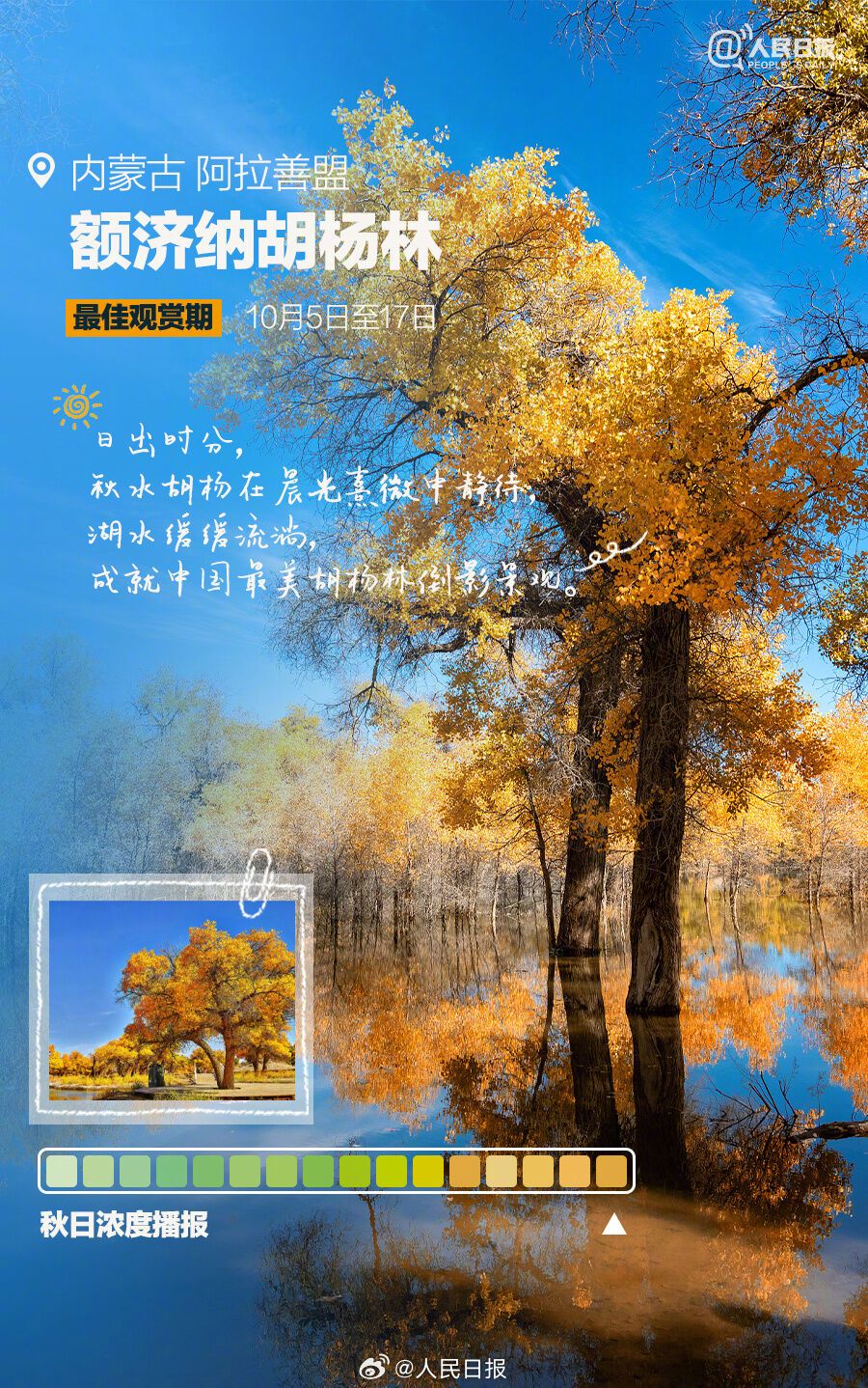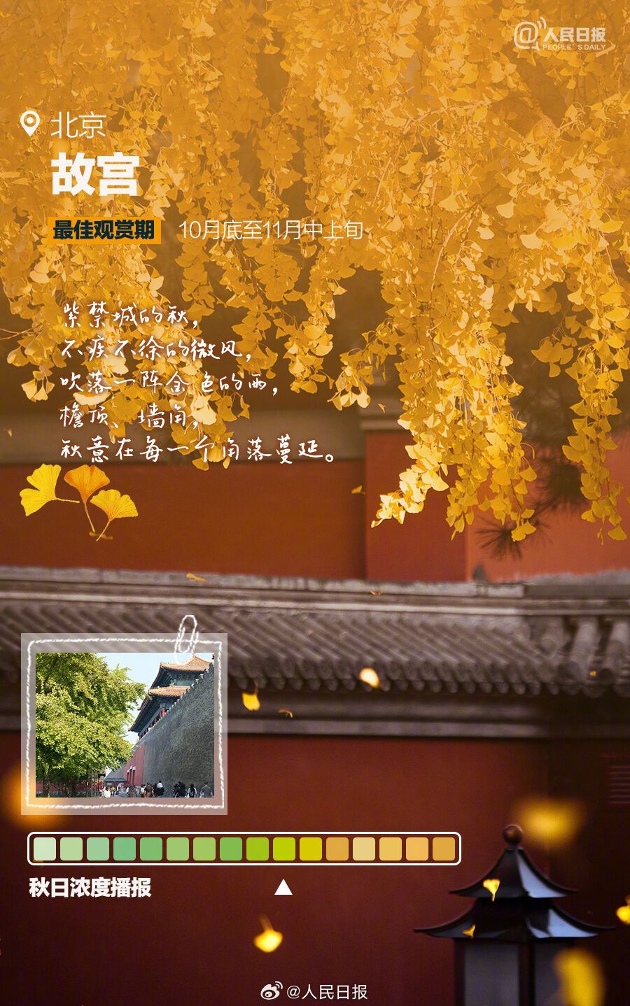 一卷秋风,一夜新凉,又到一年绝美赏秋时。阿勒泰喀纳斯风景区、阿拉善盟额济纳胡杨林、甘孜稻城亚丁等地,已进入最佳观赏期;南京栖霞山、北京故宫、腾冲银杏村等地,迷人的金色世界正在酝酿。最新赏秋地秋日浓度播报来了↓↓做个秋色猎人,一起解锁绝美秋天!