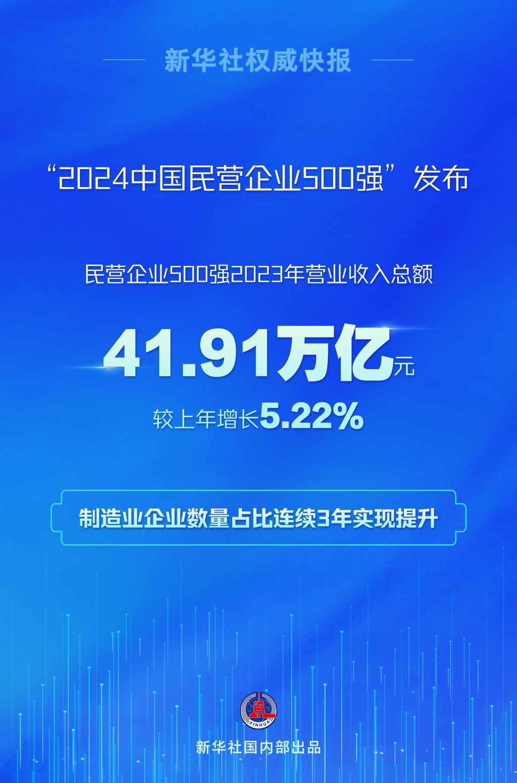 记者了解到,2023年,民营企业500强营业收入总额41.91万亿元,较上年增长5.22%,税后净利润1.69万亿元,制造业企业数量占比连续3年实现提升。民营企业500强纳税总额达1.29万亿元,较上年增长3.11%。