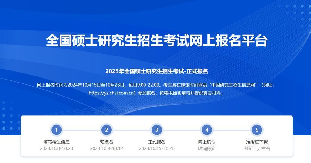网上报名时间为2024年10月15日至10月28日(网上预报名时间为2024年10月9日至10月12日,相关工作安排由各省级教育招生考试机构确定并公布),每日9:00-22:00。考生应在规定时间登录“中国研究生招生信息网”(网址:https://yz.chsi.com.cn)参加报名,按要求如实填写并提供真实材料。