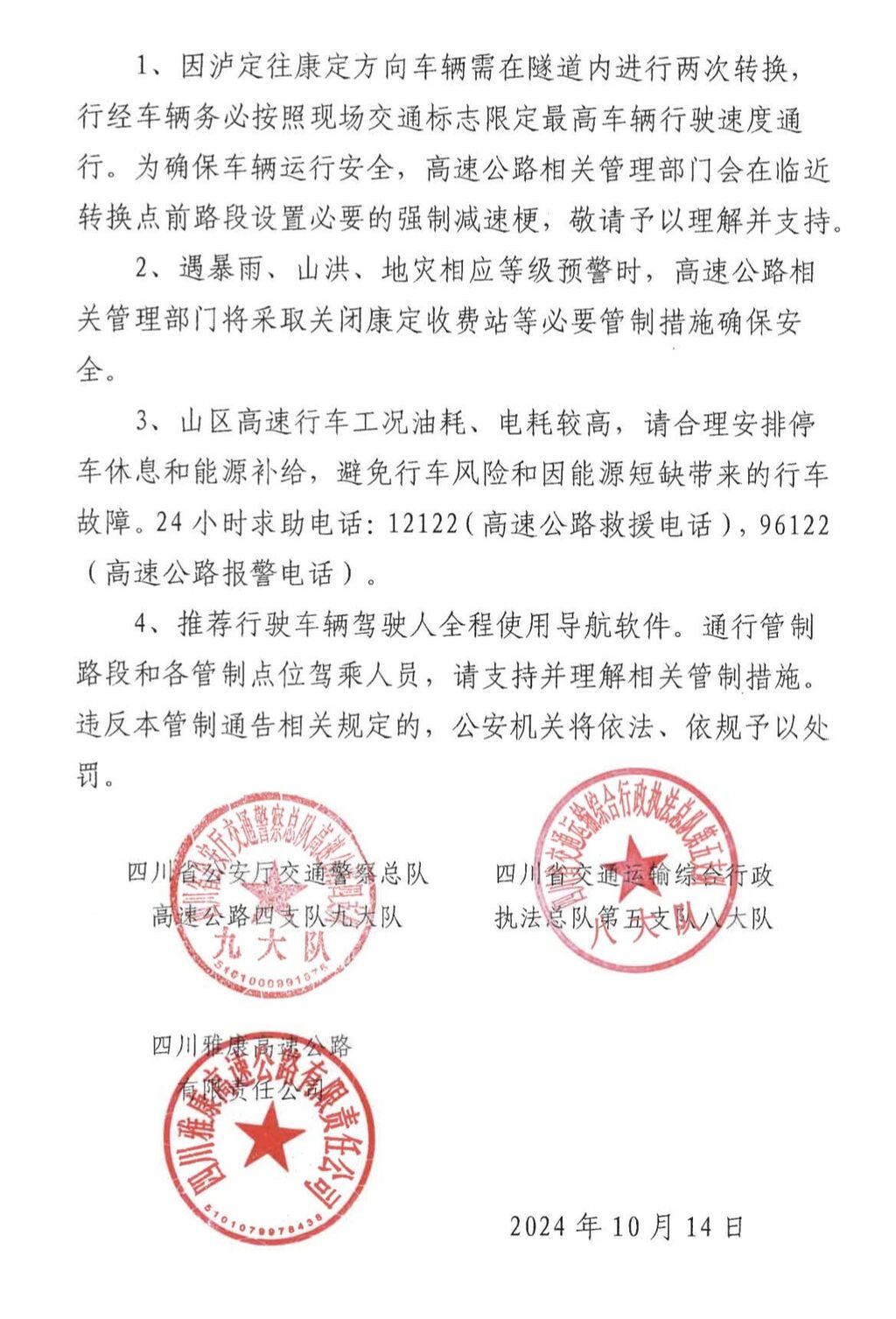 10月14日晚,四川高速公安四分局发布关于G4218雅叶高速公路泸定至康定路段实施交通管制通告。管制措施包括: