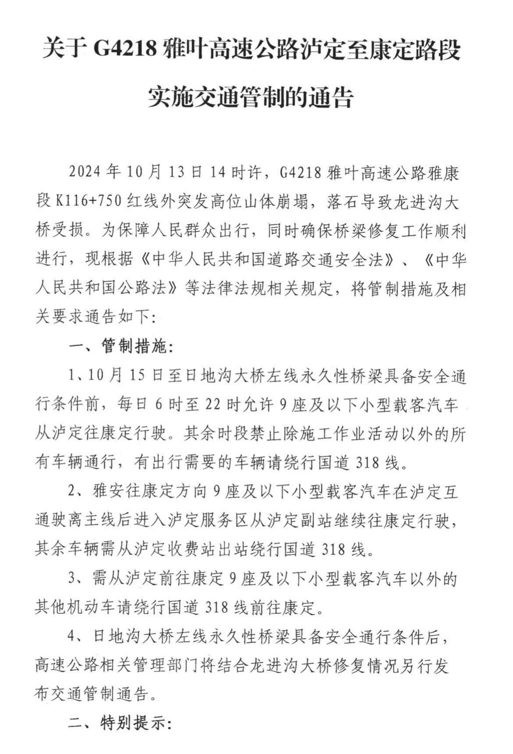 1、10月15日至日地沟大桥左线永久性桥梁具备安全通行条件前,每日6时至22时允许9座及以下小型载客汽车从泸定往康定行驶。其余时段禁止除施工作业活动以外的所有车辆通行,有出行需要的车辆请绕行国道318线。