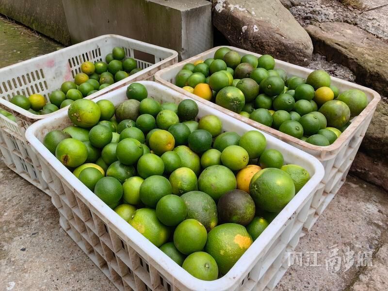 “昨天我卖了400斤,今天又摘了200斤左右。”王秋容老人坐在摇椅上,一边休息看风景,一边等待商贩上门收购血橙。院坝角落,三四筐血橙整齐地码放着,这些血橙普遍果径较小、青绿色、还未成熟,有的甚至是“太阳果”。