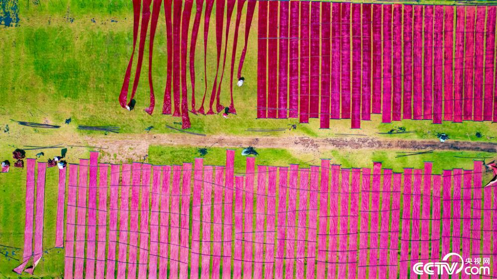 广西梧州市蒙山县丝绸工业园区晒场上,工人们趁着天气晴朗,忙着晾晒香云纱。