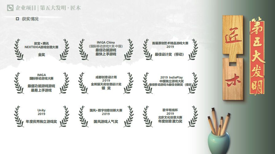 在田海博的办公室,一块榫卯积木摆件非常显眼,而这正来自东极六感的第一款游戏《匠木》,这也是一款火爆出圈的手游。《匠木》是以非物质文化遗产“榫卯”为核心的中国文化游戏产品,也是原创空间解谜类国风手机端游戏。2020年6月,该游戏全平台上线,此后相继荣获故宫、IMGA、Indieplay等颁发的多项国内外游戏大奖,并获得优秀中华传统文化游戏、Nextidea游戏创意大赛金奖等奖项,被中国共产党历史展览馆长期展示,法国吉美博物馆收藏。