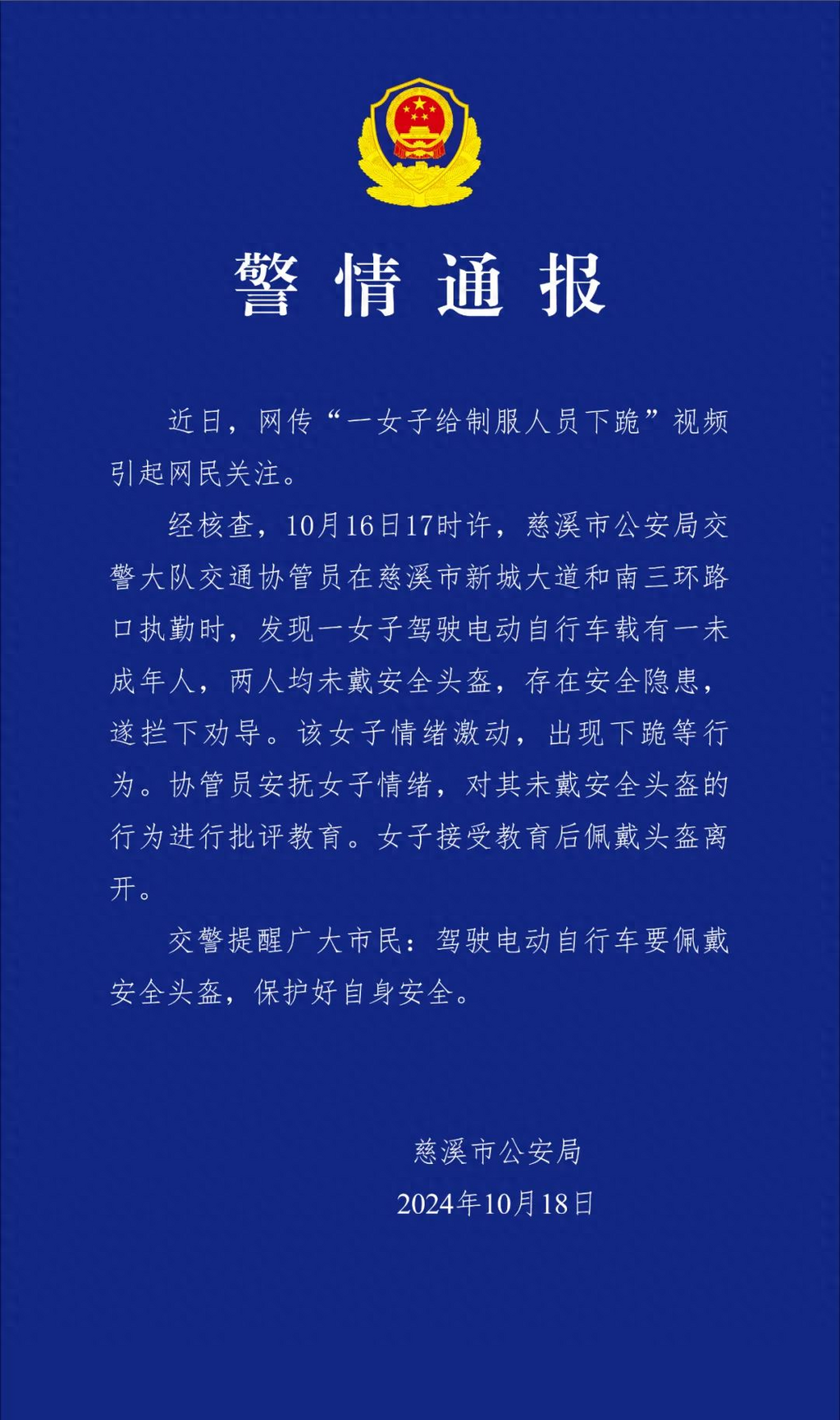 ·浙江慈溪警方通报女子给制服人员下跪:未戴头盔,被劝导时情绪激动。
