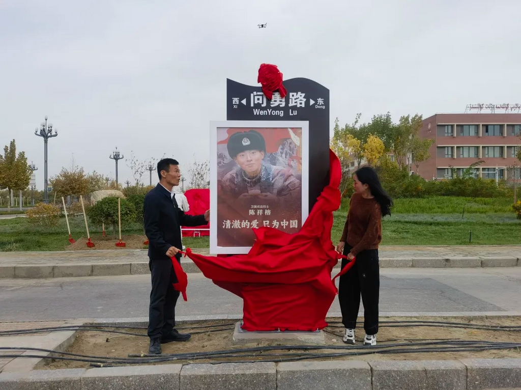 10月17日,“问勇路”在新疆和田揭牌。“问勇路”是一条新修建的道路,位于和田县新区,旨在向中印边界冲突斗争中牺牲的陈祥榕等四位烈士致敬。受邀参加揭牌仪式的陈祥榕烈士的母亲姚久穗,在看到儿子照片的那一刻忍不住流下眼泪:“‘问勇路’是儿子和牺牲战友生命的延续”。