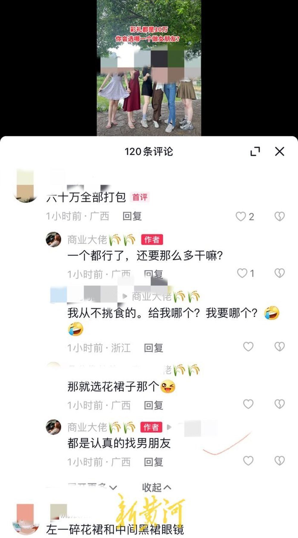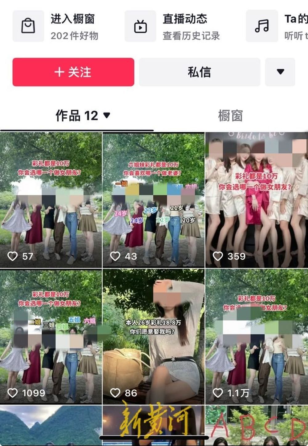 大概过了一个月,一个在湖南长沙的网友私信我,说在抖音上有个名叫“商业大佬”的用户,盗用了我们柳州出行打卡网红景点的合照,还配文“彩礼都是10万,你会选哪一个做女朋友?”而且还打上了#美女如云##甜美女孩#的话题。之后我打开抖音搜索到这个账号,发现他有三十多万粉丝,而且他的主页还有其他女性的照片。配文大多数都是低俗、令人生理不适的文字。感觉被盗图的不只有我和室友,也有其他女性。另外,他的评论区里还有很多人跟他互动,污言秽语,说什么“六十万全部打包”“必须选戴眼镜的,试过就知道”。