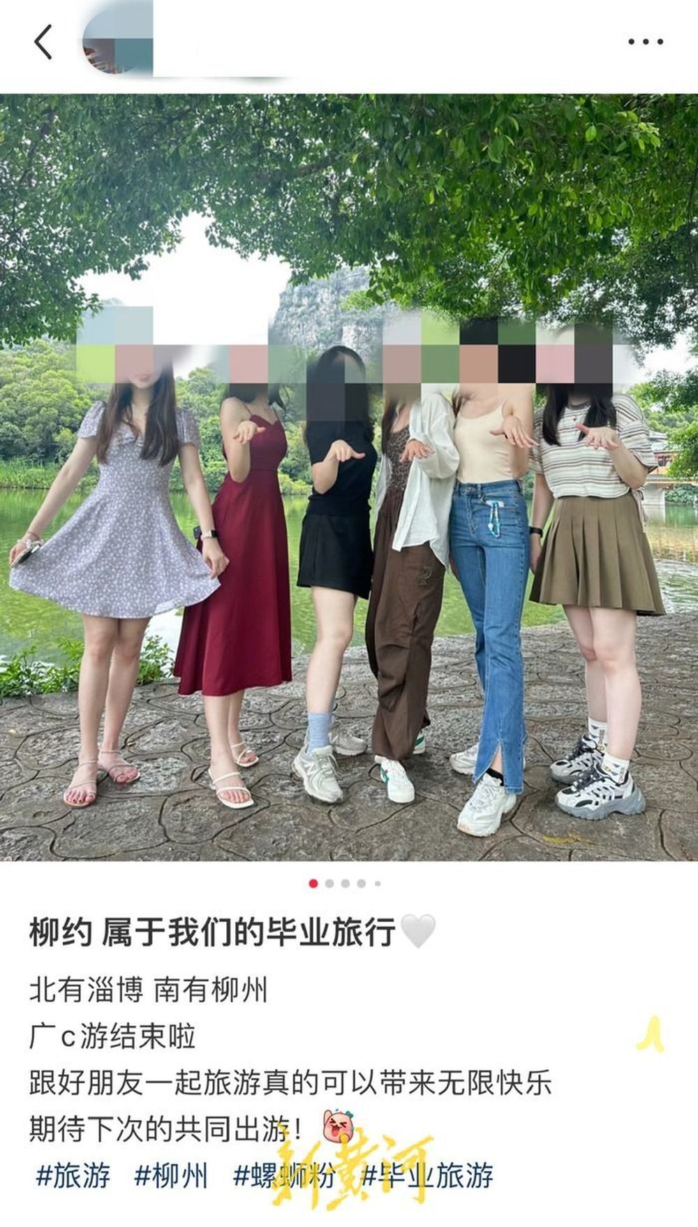 小婷:我们大学室友六个人其实已经毕业好几年了,毕业后也都在广州工作和生活,但因为各种原因导致我们一直没能完成毕业旅行的心愿。去年9月中旬大家有了时间,便相约一起去广西柳州品尝当地美食,打卡网红景点。因为我有记录生活、分享生活在社交媒体上的习惯,9月18日那天,我习惯性地在小红书上发了一条“柳约,属于我们的毕业旅行”的图文内容。