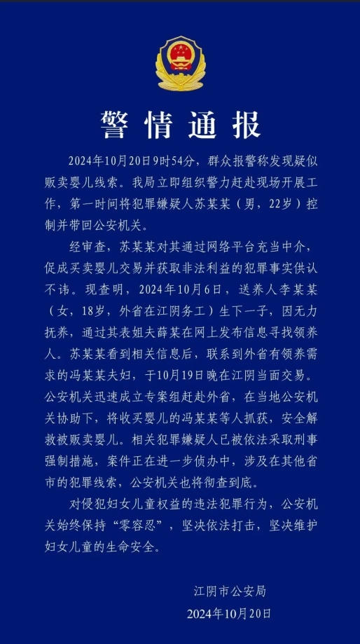 ·江苏无锡江阴警方通报“出生十几天的婴儿夜间被卖”:相关嫌犯已被采取刑事强制措施。