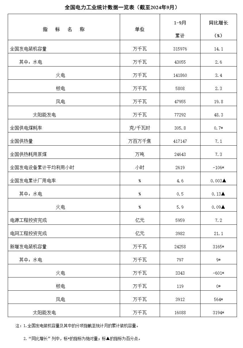 截至9月底,全国累计发电装机容量约31.6亿千瓦,同比增长14.1%。其中,太阳能发电装机容量约7.7亿千瓦,同比增长48.3%;风电装机容量约4.8亿千瓦,同比增长19.8%。