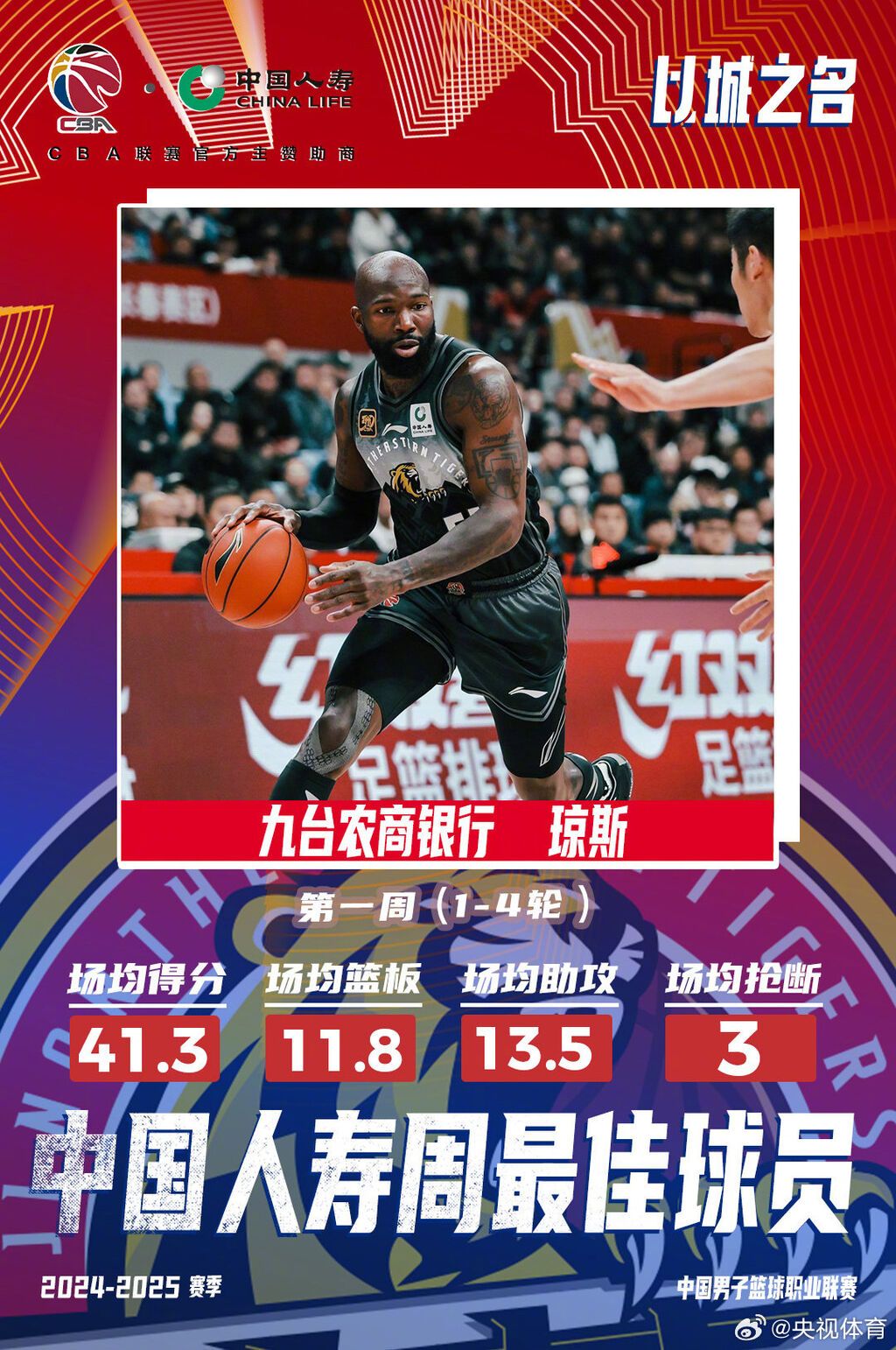 琼斯首周场均得到41.3分11.8篮板13.5助攻的大号三双数据,率领球队取得2胜2负的战绩;胡金秋场均24.5分8篮板,投篮命中率70.5%,带领球队4战全胜。