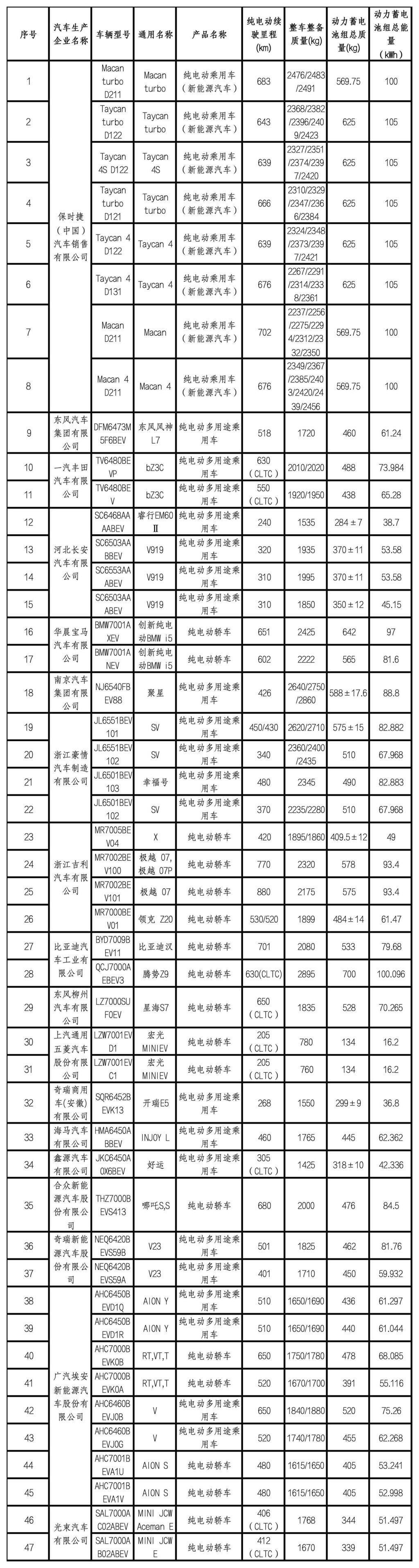 纯电动汽车-乘用车车型如下