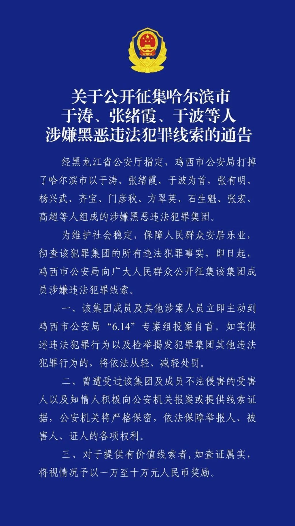 近日,黑龙江省鸡西市警方发布“关于公开征集哈尔滨市于涛、张绪霞、于波等人涉嫌黑恶违法犯罪线索的通告”。