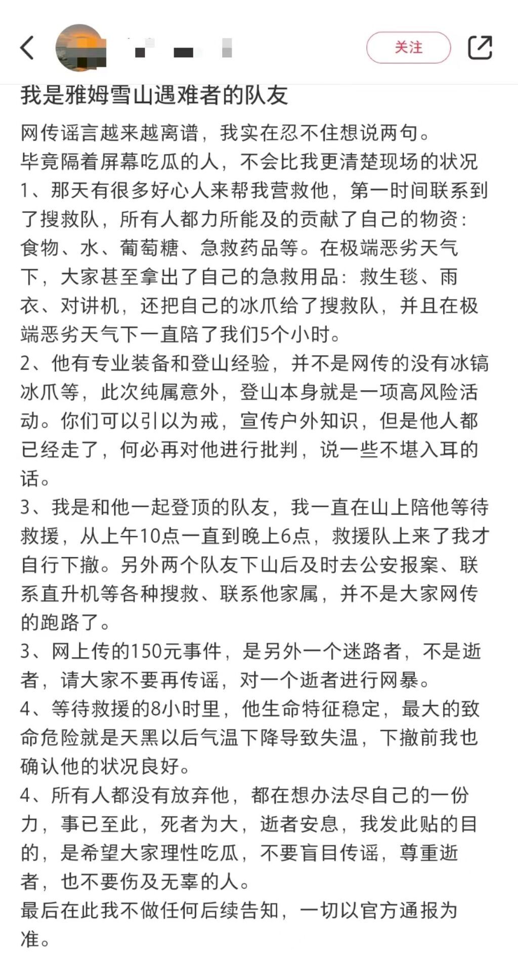 张先生所发帖子评论区,一名自称去世男子队友的女子发帖表示:“我是遇难者的队友,借楼辟谣。1.他有专业装备和登山经验,并不是网传的没有冰镐冰爪等,此次纯属意外。你们可以引以为戒,宣传户外知识,但是他人都已经走了,何必再对他进行批判,说一些不堪入耳的话。2.我是和他一起登顶的队友,我一直在山上陪他等待救援,从上午10点一直到晚上6点,救援队上来了我才自行下撤。另外两个队友下山后及时去公安报案、联系搜救、联系他家属,并不是大家网传的跑路了。3.网上传的150元事件,是另外一个迷路者,不是逝者,请大家不要再传谣,对一个逝者进行网暴。4.所有人都没有放弃他,事已至此,死者为大,逝者安息,希望大家理性吃瓜,不要盲目传谣,尊重逝者。”