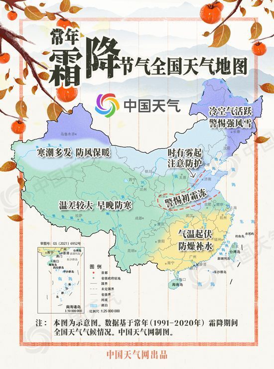 从中国天气网推出的常年霜降节气全国天气地图可以看出,霜降期间,西北、东北多寒潮过程,部分地区已呈现出一派“寒风落叶”的初冬景象,尤其是黑龙江、吉林、新疆北部一带还需警惕强风雪天气,有计划前往当地的小伙伴,不要小觑初冬时节寒潮的威力,要做好防冻保暖工作。同时,华北、黄淮一带时有雾扰,能见度不佳,公众尽量减少在雾和霾高发时段外出,如果开车出行,注意控制车距。