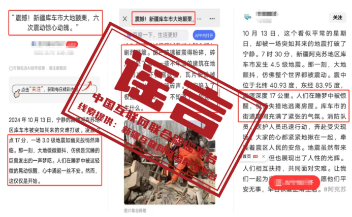 详情:10月13日,新疆阿克苏地区库车市连续发生6次地震,震中均位于荒漠区域。截至14日10时,库车市通讯、供电、交通道路等状况正常,未接到人员伤亡和财产损失情况报告。但有部分自媒体账号在网络上发布“震撼!新疆库车市大地颤栗,六次震动惊心动魄”文章以及地震废墟图片等。对此,当地网信部门发布辟谣声明,网传废墟和救援图片并非真实的地震现场,系自媒体账号为博取流量吸引眼球,罔顾事实和真相,编造地震谣言,拼接与此次地震不符的地震废墟或灾后救援凄惨图片,混淆视听误导网民。(来源:“新疆网络举报”微信公众号)